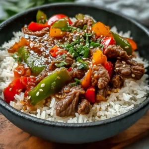 While the sauce simmers, make sure your rice is cooked and warm. Add a generous scoop of rice to each bowl, then top with a hearty portion of the beef and pepper mixture. Finish with sesame seeds and sliced green onions for a fresh, bright touch.