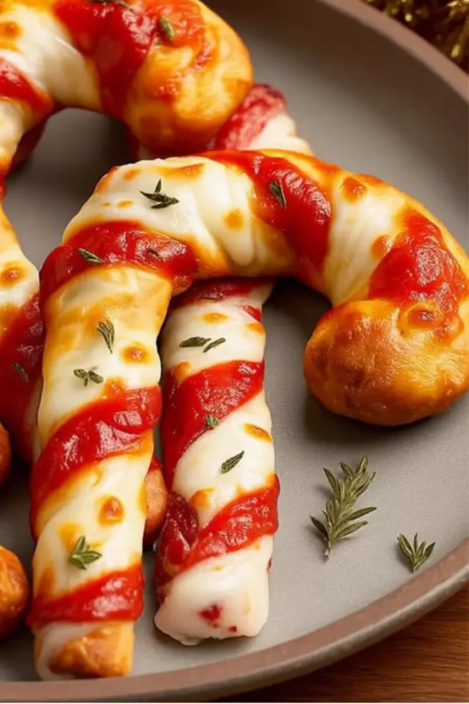 Serve candy cane pizza breadsticks as an appetizer with marinara, ranch, or cheese sauce. They also work well on a holiday snack board alongside vegetables, olives, and cheese cubes. For kids, pair them with mild dipping sauces and fruit.