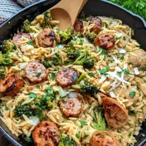 If you’re craving a cozy and flavorful dinner, this Delicious One-Pot Chicken Sausage Broccoli Orzo is the perfect recipe to make. It combines tender orzo, savory chicken sausage, and bright, fresh broccoli—all cooked together in one skillet for a quick, comforting weeknight meal.