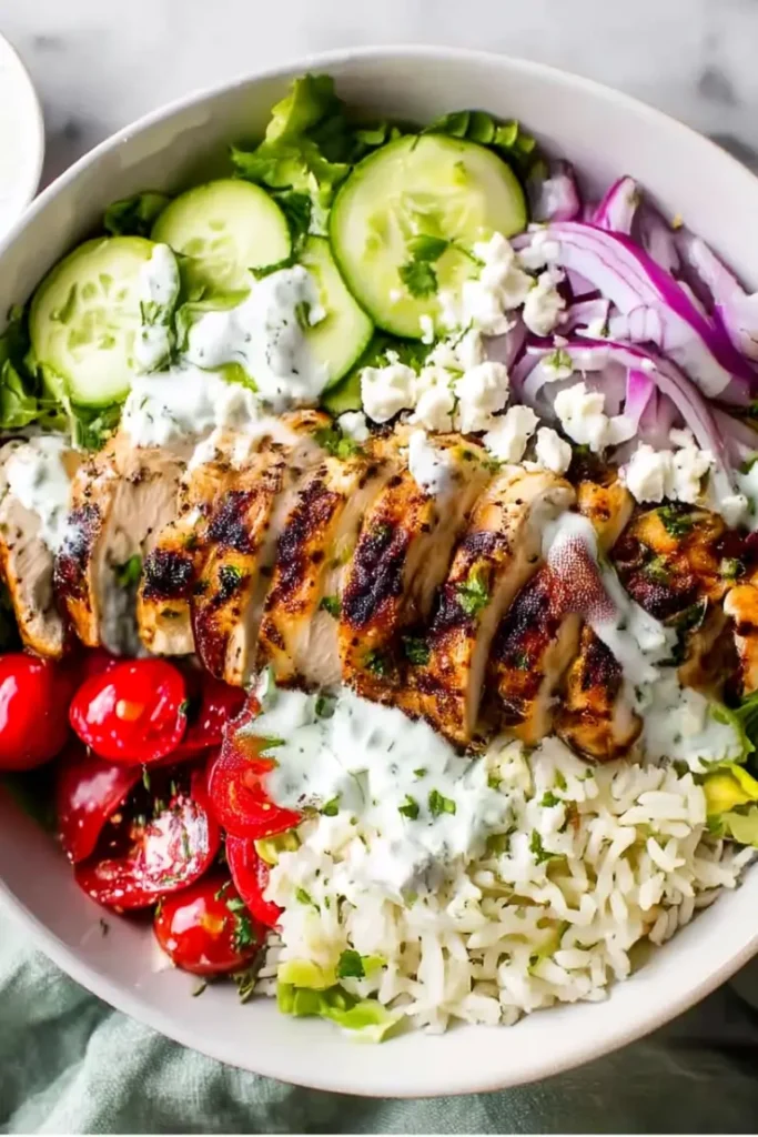 Chicken thighs can be used instead of breasts for a slightly juicier result. Quinoa adds extra protein, while rice offers a more traditional base. If you are dairy sensitive, use a dairy free yogurt for the tzatziki or skip the sauce and drizzle the bowls with lemon juice and olive oil. Olives are optional but add a salty bite that many people enjoy.