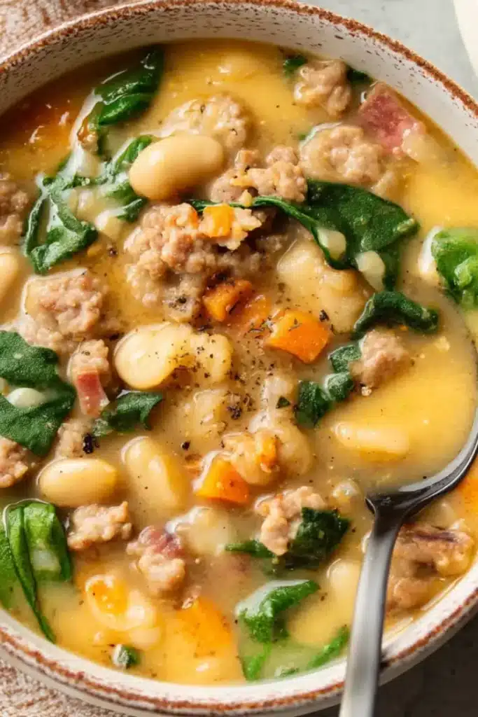 If you’re searching for a cozy, one-pot wonder that delivers bold flavor without fuss, this easy hearty Italian sausage & white bean soup is your answer. Packed with savory sausage, smoky bacon, tender cannellini beans, and fresh spinach—all simmered in a rich, aromatic broth—this soup feels indulgent yet stays dairy-free and straightforward to make. Perfect for chilly nights, busy weeknights, or meal prep, it’s a satisfying dish that brings warmth to the table with minimal cleanup.