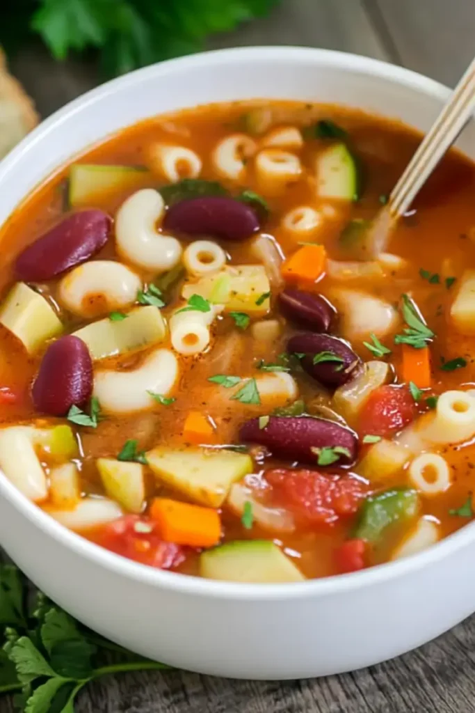 The balance of vegetables, beans, pasta, and tomato broth closely mirrors the restaurant version. Using Italian seasoning and the right ratio of broth to tomatoes helps recreate that familiar flavor.