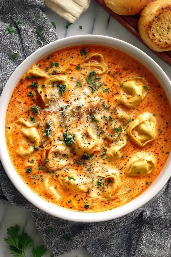 This soup is warm, satisfying, and surprisingly simple to prepare. It tastes rich and indulgent, yet it comes together in one pot with everyday ingredients. The tortellini make it filling enough to serve as a main dish, while the creamy tomato-Parmesan base keeps every bite comforting and flavorful.