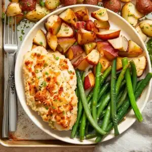 This Sheet Pan Crispy Parmesan Garlic Chicken dinner is the ultimate weeknight solution—flavorful, crunchy, and completely hands-off after prep. Juicy chicken breasts coated in a crispy parmesan-garlic crust roast alongside tender baby potatoes and fresh asparagus, making a full, balanced meal with minimal cleanup.