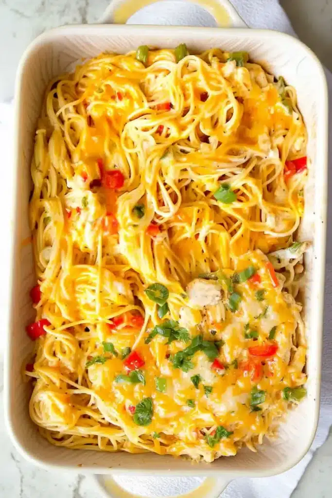 This recipe blends tender shredded chicken, perfectly cooked spaghetti, rich cheese, and a touch of heat into one bubbling casserole that feels both nostalgic and exciting. It is ideal for busy weeknights, family gatherings, church suppers, or anytime you want a guaranteed crowd-pleaser.
