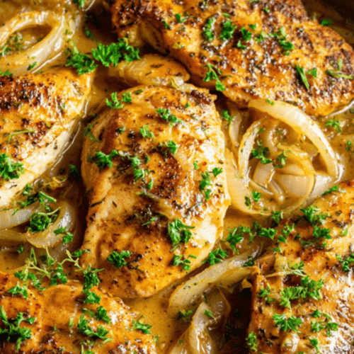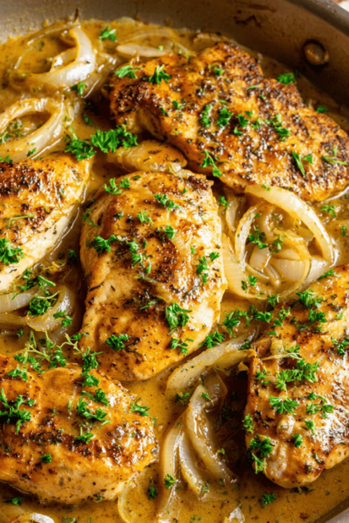 First, the chicken stays incredibly juicy. Lightly searing the chicken before simmering it in gravy locks in flavor and keeps the meat tender. Second, the onion gravy is rich without being heavy. Slowly cooked onions add natural sweetness that balances the savory seasonings perfectly.